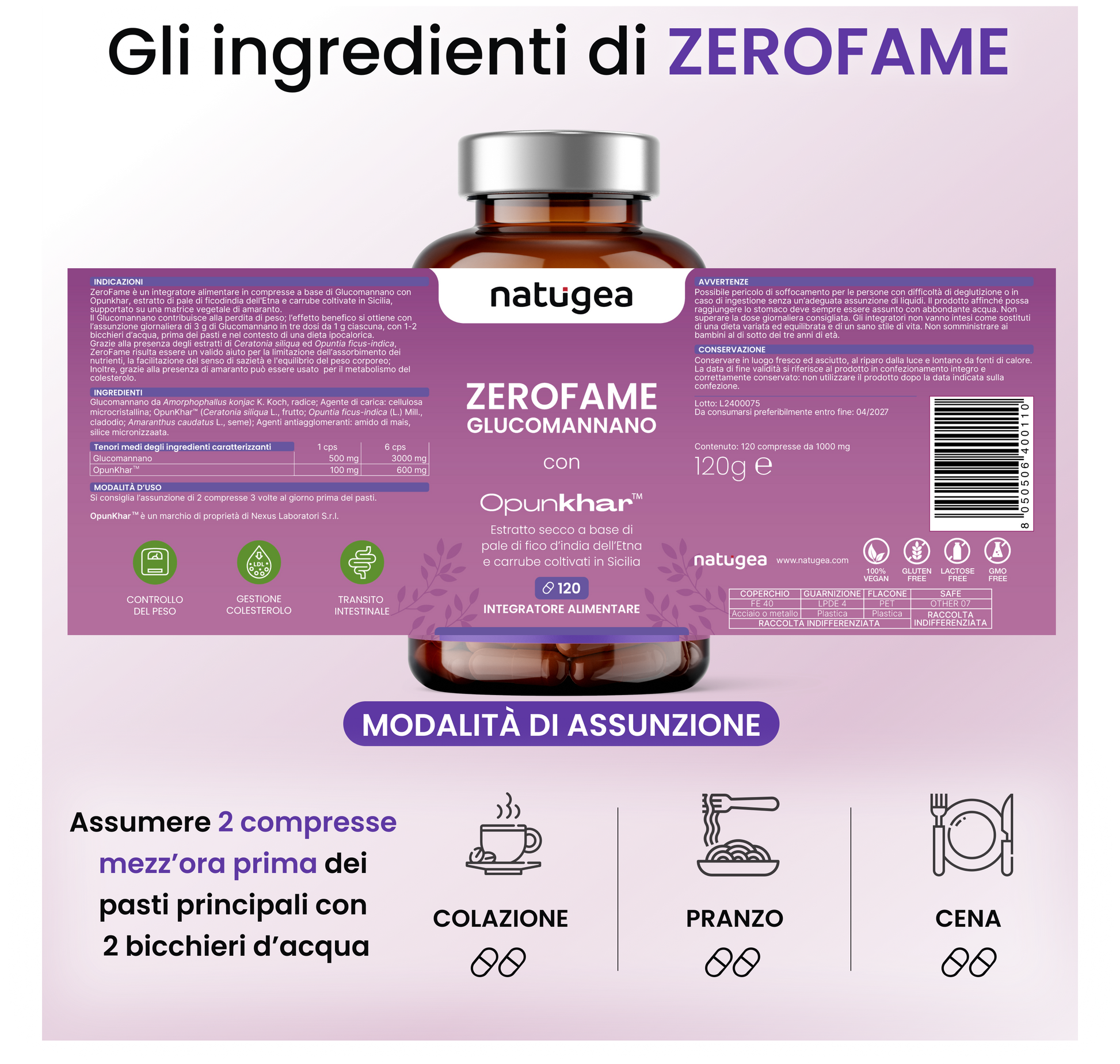 - ZEROFAME CON GLUCOMANNANO E OPUNKHAR - Il Glucomannano è una fibra alimentare solubile estratta dalla radice del konjac una pianta originaria dell'Asia. Grazie alla sua capacità di assorbire grandi quantità di acqua, formando un gel voluminoso nello stomaco, stimola i recettori della sazietà riducendo così l'appetito e l'assunzione di cibo.